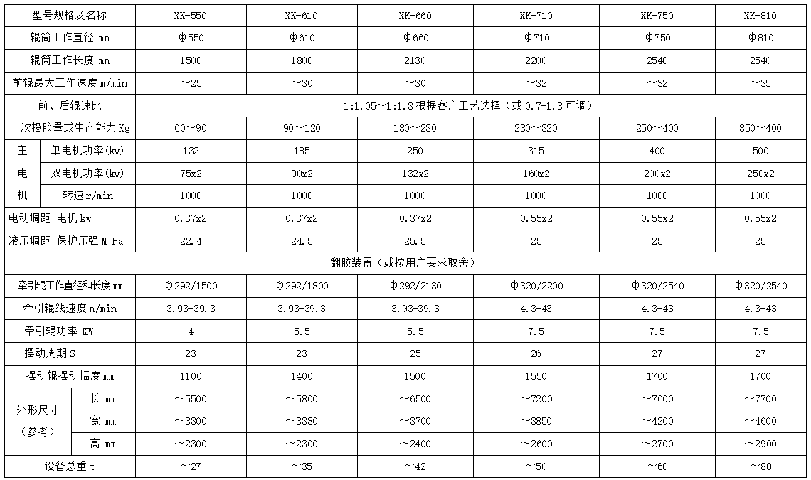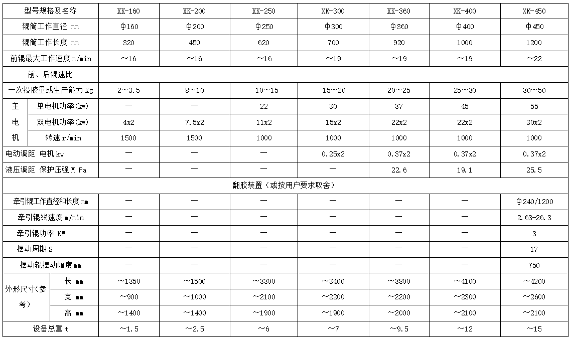 本系列产品是通用型产品,提供工厂作多种用途,可以满足橡胶制品厂作橡胶塑炼、混炼、热炼和压片等各项工艺。产品选用直流、交流或交流变频电机为动力,可提供定速或变速、定速比或变速比的各种组合形式的开炼机及压片机;辊筒采用合金冷硬铸铁,冷却方式有周边钻孔和中空冷却;减速机为全硬齿面减速机,与辊筒用万向连轴节连接,方便调距;调距形式可选手动、电动或液压调距;挡胶板有固定、轴向可调、翻转三种形式;另外,用户还可选配翻胶装置、切刀等部件来满足自己的工艺需要。我公司生产的该系列产品品种多、部件全、配置高,具有内在品质与外观的完美结合,是中、高端用户的不悔选择。